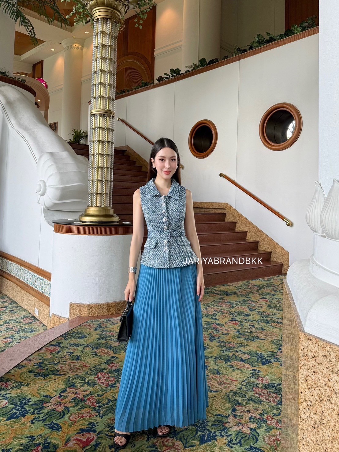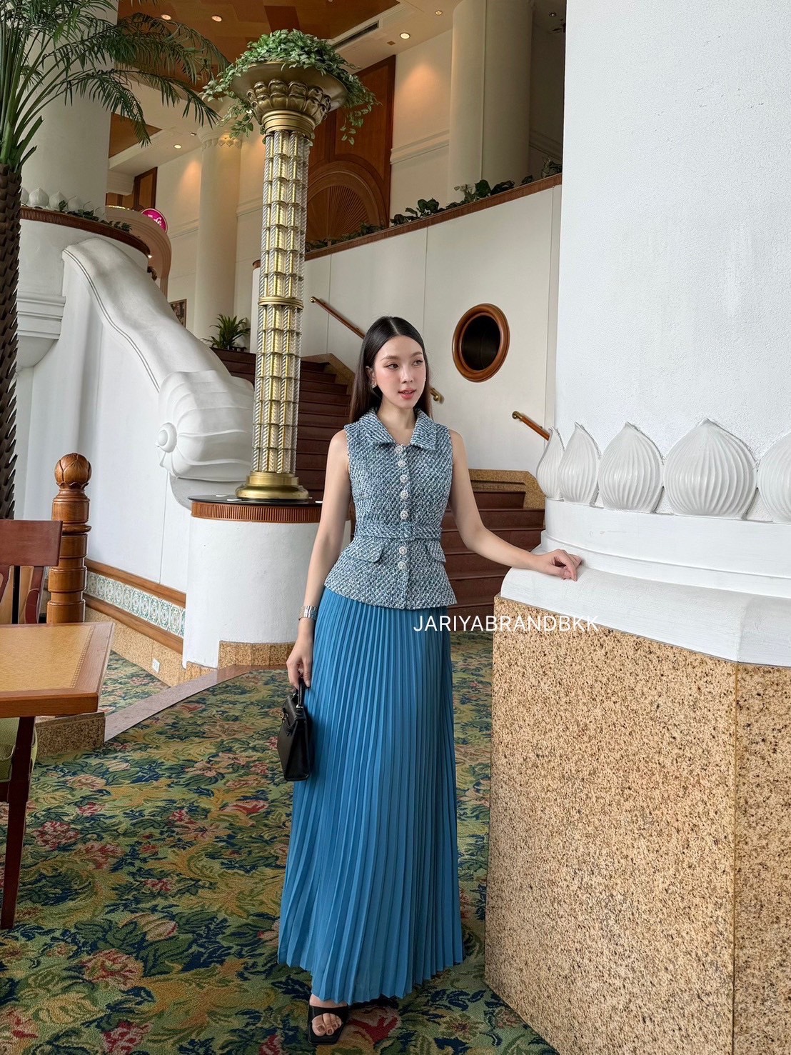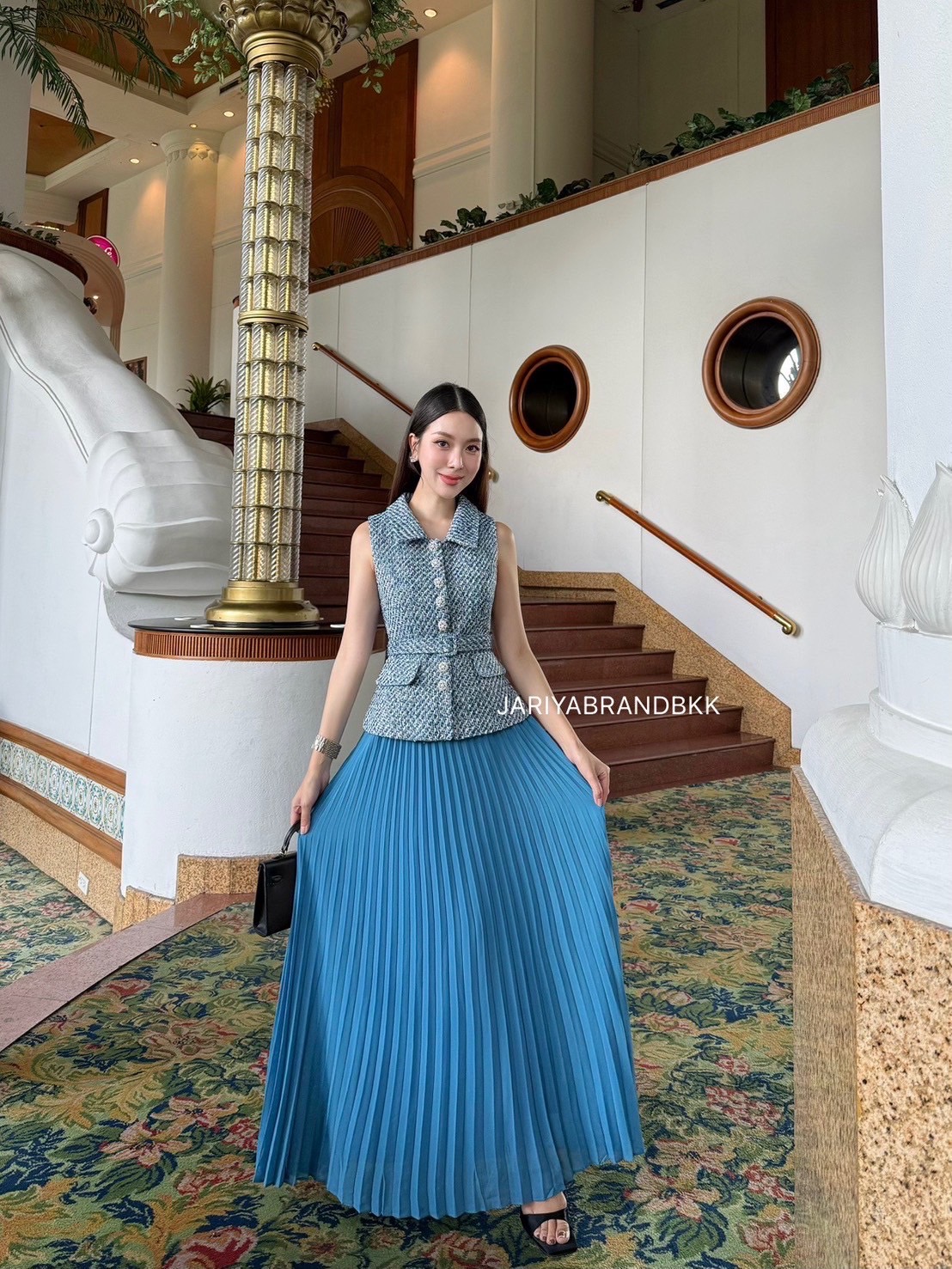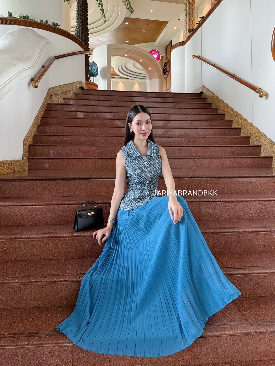 💃🏻ด้วยดีไซน์เสื้อทวีตคอปกคลาสสิค ผสานกระโปรงพลีทยาวพริ้วไหวทุกการเคลื่อนไหว