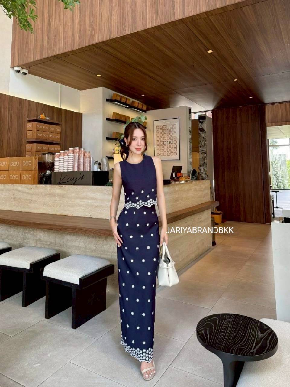 เดรสยาวโทน น้ำเงินเข้ม แต่งลายดอกสีขาว เพิ่มความหวานละมุนตัดกับโทนเข้มอย่างลงตัว