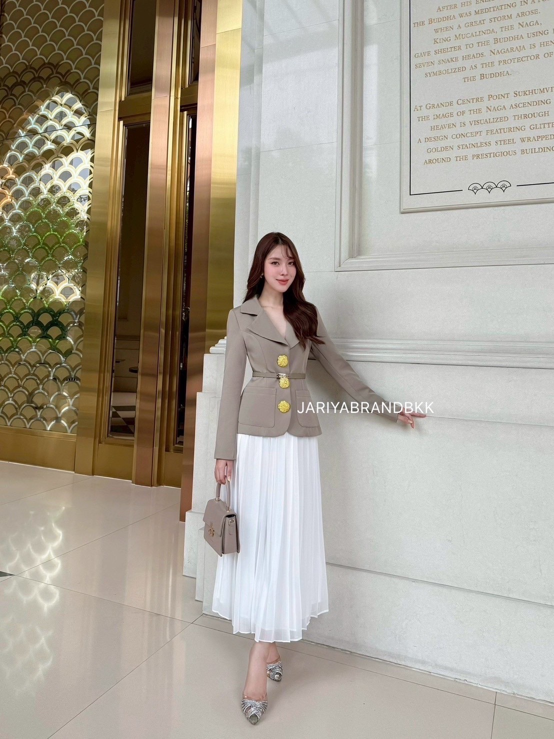 🤍แจ็กเก็ตสีคาเฟ่โทนสุภาพ ตัดกับกระโปรงพลีทสีขาวบริสุทธิ์